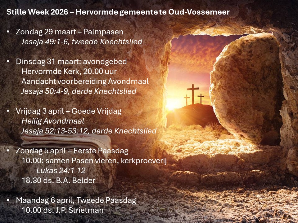 Welkom op de site van de Hervormde Gemeente van Oud-Vossemeer. Op deze site vindt u meer informatie over deze gemeente en over het christelijk geloof. Iedere zondag komen wij tweemaal samen in de Johannes de Doper kerk. Als christelijke gemeente verkondigen wij het Evangelie van het Koninkrijk van God aan alle mensen.